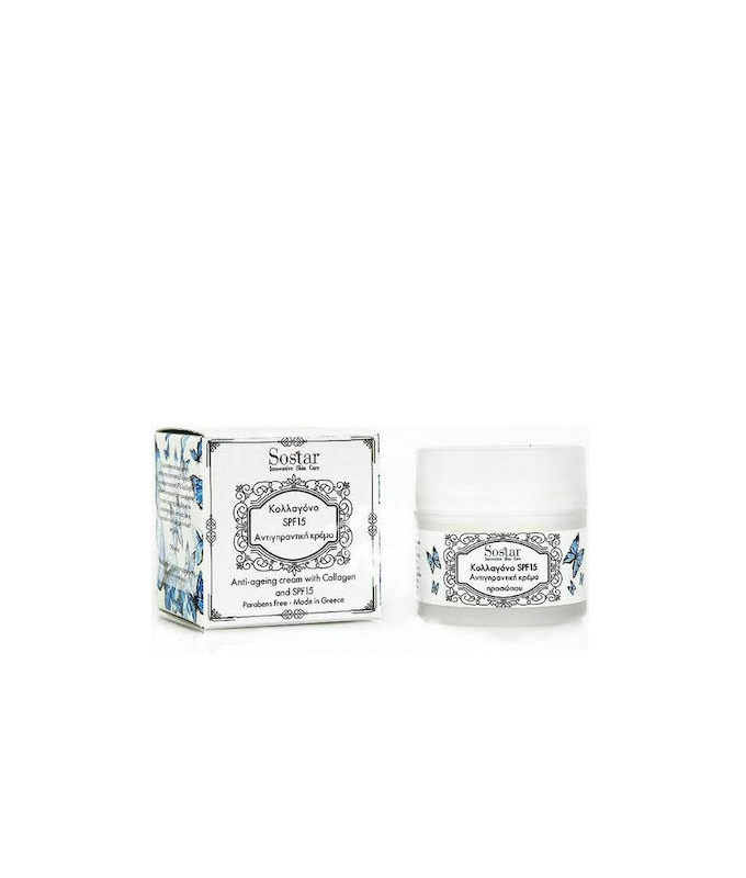 Κρέμα προσώπου και λαιμού εντατικής αντιγήρανσης και προστασίας με κολλαγόνο και αντηλιακό δείκτη προστασίας SPF15. Το κολλαγόνο ασκεί έντονη αντιγηραντική δράση επαναφέροντας την φυσικά υγρασία της επιδερμίδας και την ελαστικότητά της, ενώ ο αντηλιακός δείκτης προστατεύει την επιδερμίδα απο την ηλιακή ακτινοβολία.