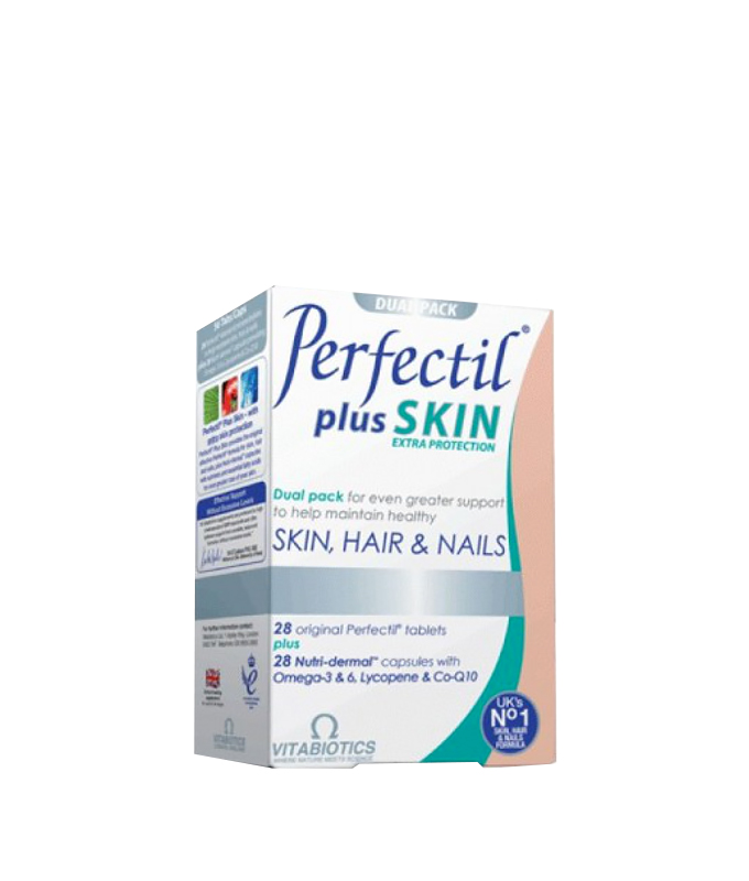 Το συμπλήρωμα διατροφής Perfectil Plus Skin της Vitabiotics είναι μια μοναδική διπλή συσκευασία που συνδυάζει τις ταμπλέτες Perfectil με τις δερμο-θρεπτικές κάψουλες με ωμέγα-3 & 6 λιπαρά οξέα, λυκοπένιο, λουτεΐνη, συνένζυμο Q10 και βιοτίνη.