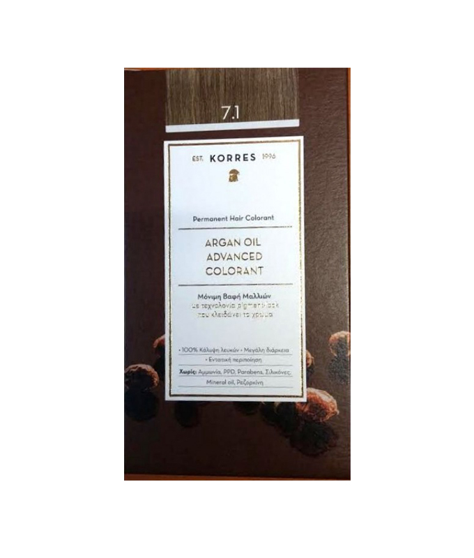 KORRES ARGAN OIL ADVANCED COLORANT No 7.1 ΞΑΝΘΟ ΣANTPE Μόνιμη βαφή μαλλιών με τεχνολογία pigment-lock που κλειδώνει το χρώμα χωρίς τη χρήση αμμωνίας.