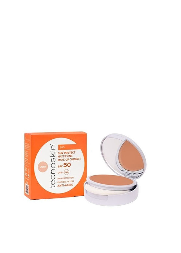 Το Tecnoskin SUN PROTECT Mattifying Make-Up Compact SPF50 είναι αντηλιακό make-up σε compact μορφή που συνδυάζει πολύ υψηλή αντηλιακή προστασία με κάλυψη και ομοιόμορφο αποτέλεσμα στην επιδερμίδα. Η σύνθεσή του περιέχει αποκλειστικά ανόργανα φίλτρα UV, προσφέροντας αξιόπιστη προστασία από την ηλιακή ακτινοβολία με ήπια δράση, κατάλληλη ακόμη και για ευαίσθητες επιδερμίδες.