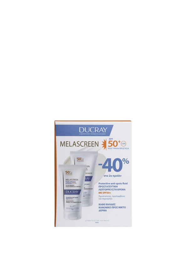 Το αντηλιακό γαλάκτωμα Melascreen Fluide Antitaches Protecteur SPF50+ της Ducray περιορίζει και μειώνει τις δυσχρωμίες που οφείλονται στον ήλιο, τις εντοπισμένες καφέ κηλίδες και τις κηλίδες γήρανσης.